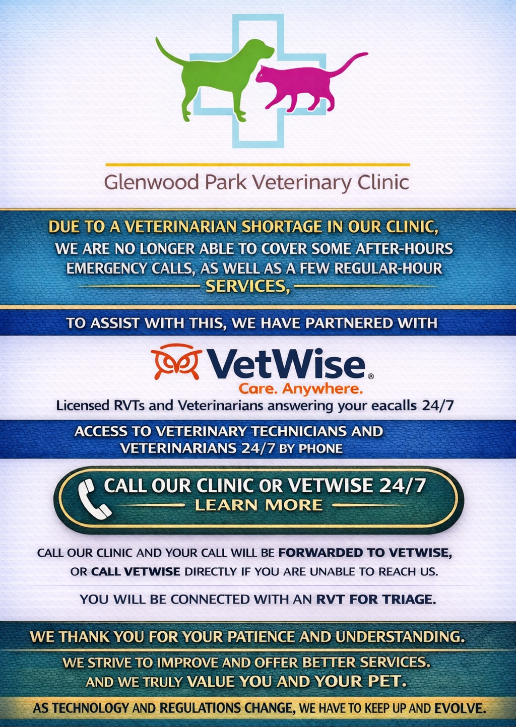 At Glenwood Park Veterinary Clinic, you can expect state-of-the-art medical care for your four-legged companions. We believe in nurturing the human-animal bond and creating a harmonious relationship between people and animals. You can expect to be greeted by a courteous receptionist, clean exam rooms, friendly doctors, and caring technicians. We appreciate the role we get to play in your pets' health care.If you have any questions or comments about how we can care for your pet, please contact us today at (780) 725-0133.